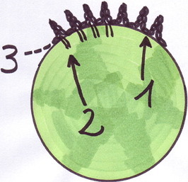 6 Luftmaschen häkeln, dann die 6. und die 2. Masche mit einer festen Masche zusammenhäkeln, dann wiederum 6 Luftmaschen… solange, bis der „Strahlenkranz“ um den Rand des genähten „Sonnenballs“ paßt (siehe Abbildung II, 3).