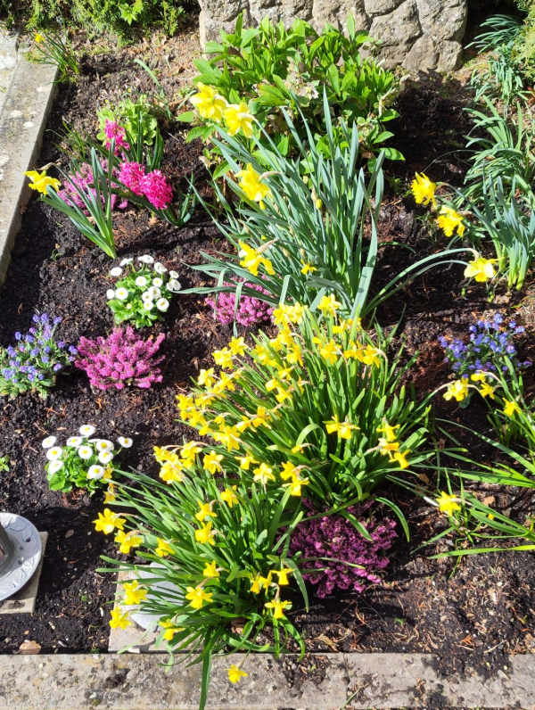 In diesem Frühjahr war der Pflanzaufwand dann minimal, da die Schneeheide einfach stehen bleiben durfte und die Christrose sowie viele Zwiebelpflanzen seit vielen Jahren im Grab sind. Die Osterglocken und Schneeglöckchen treiben jedes Jahr zuverlässig aus und blühen prächtig. Die Hyazinthen sind eher Wackelkandidaten, da sie in manchen Jahren nur grünen, aber nicht blühen, die beiden letzten Jahre gefielen ihnen aber anscheinend besser und sie trieben wieder Blüten. Im Herbst werden ich vielleicht noch einige Zwiebeln von Trauben- und Sternhyazinthen stecken. Man sollte übrigens die Blätter der Zwiebelpflanzen so spät wie möglich zurückschneiden, damit sie Kraft fürs nächste Jahr tanken können. Neu gepflanzt habe ich diesen Frühling nur zwei Gänseblümchen und zwei Vergissmeinnicht. Eine Alternative wären Primeln oder Stiefmütterchen gewesen. Mit den großblütigen Primeln habe ich aber meist nicht viel Glück, auch wenn ich sie sehr gerne mag. Eine Alternative wären langstielige kleinblütige Primeln, die deutlich robuster und zudem noch mehrjährig sind. Sie sehen wie eine Mischung aus Primel und Schlüsselblumen aus und können in der Tat mit Schlüsselblumen Hybriden bilden (dazu mehr in einem anderen Artikel), eine Gärtnerei in der Nähe verkauft sie als Nostalgieprimeln.