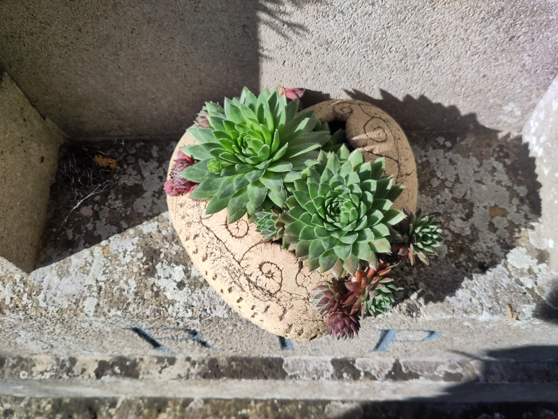 Zuverlässig und anspruchslos ist auch immer Hauswurz wie der hier in einer kleinen Pflanzschale auf dem Grabstein: