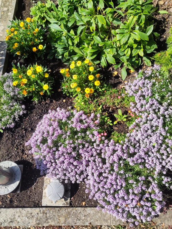 Nach ein bisschen Recherche hatte ich mich letztes Jahr entschlossen, das Grab für den Sommer mit Duftsteinrich, Strohblumen und Mittagsblumen zu bepflanzen. Die Strohblumen machten sich gut und kamen auch an heißen trockenen Tagen gut klar. Die Mittagsblumen kamen vielleicht sogar noch besser über den Sommer, da sie aber sehr kleinblütig sind und ihre Blüten eben nur in der vollen Sonne öffnen, wirkten sie auf dem Grab leider etwas verloren. Der Duftsteinrich hingegen hat den Sommer zwar überlebt, kam aber bei weitem nicht so gut mit der Trockenheit klar, wie gedacht, hat alle Blüten abgeworfen und vor sich hingekümmert. Die Christrose im Hintergrund des Bilds lässt zwar gerade die Blätter hängen, wächst aber schon seit vielen Jahren auf dem Grab, ist gut verwurzelt und kommt auch gut mit Trockenheit klar. Alles in allem musste ich zwar weiterhin in den heißen trockenen Wochen regelmäßig gießen, aber weit weniger, als im Vorjahr.