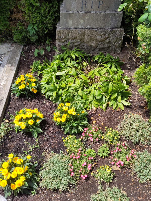 Dieses Jahr habe ich für den Sommer wieder die bewährten Strohblumen und zusätzlich Portulakröschen sowie auch direkt ins Grab einige Hauswurzpflanzen gepflanzt. Die heißen trockenen Tage stehen noch aus, aber ich bin zuversichtlich.